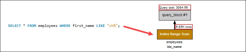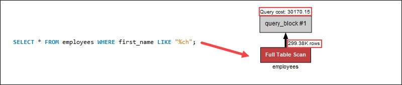 搜索開頭的通配符不應(yīng)用索引。相反,全表掃描單獨搜索每一行,增加了該過程中的查詢成本。在示例查詢中,